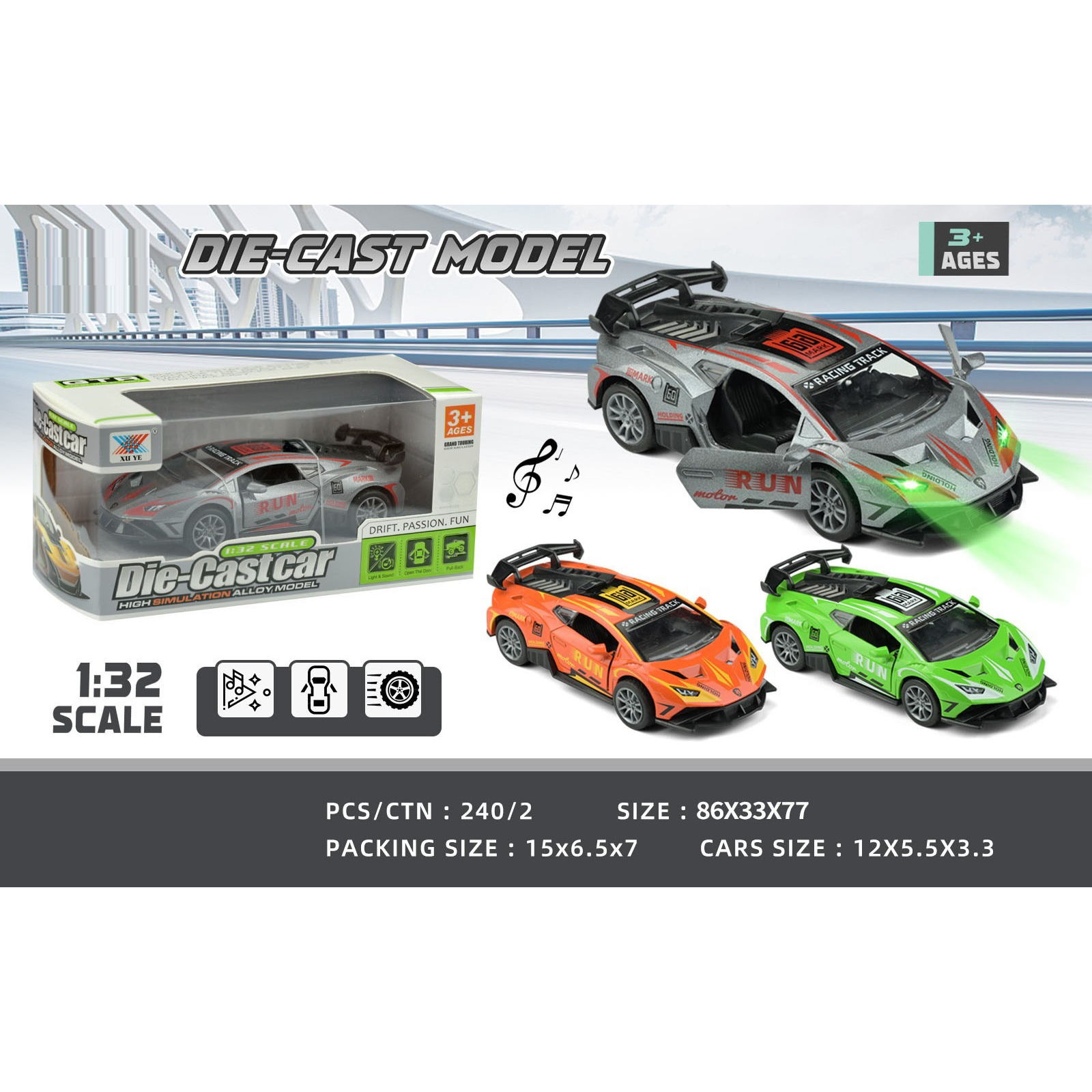 1:32 alloy Lamborghini Huracan racing lights music pullback (1 piece) |