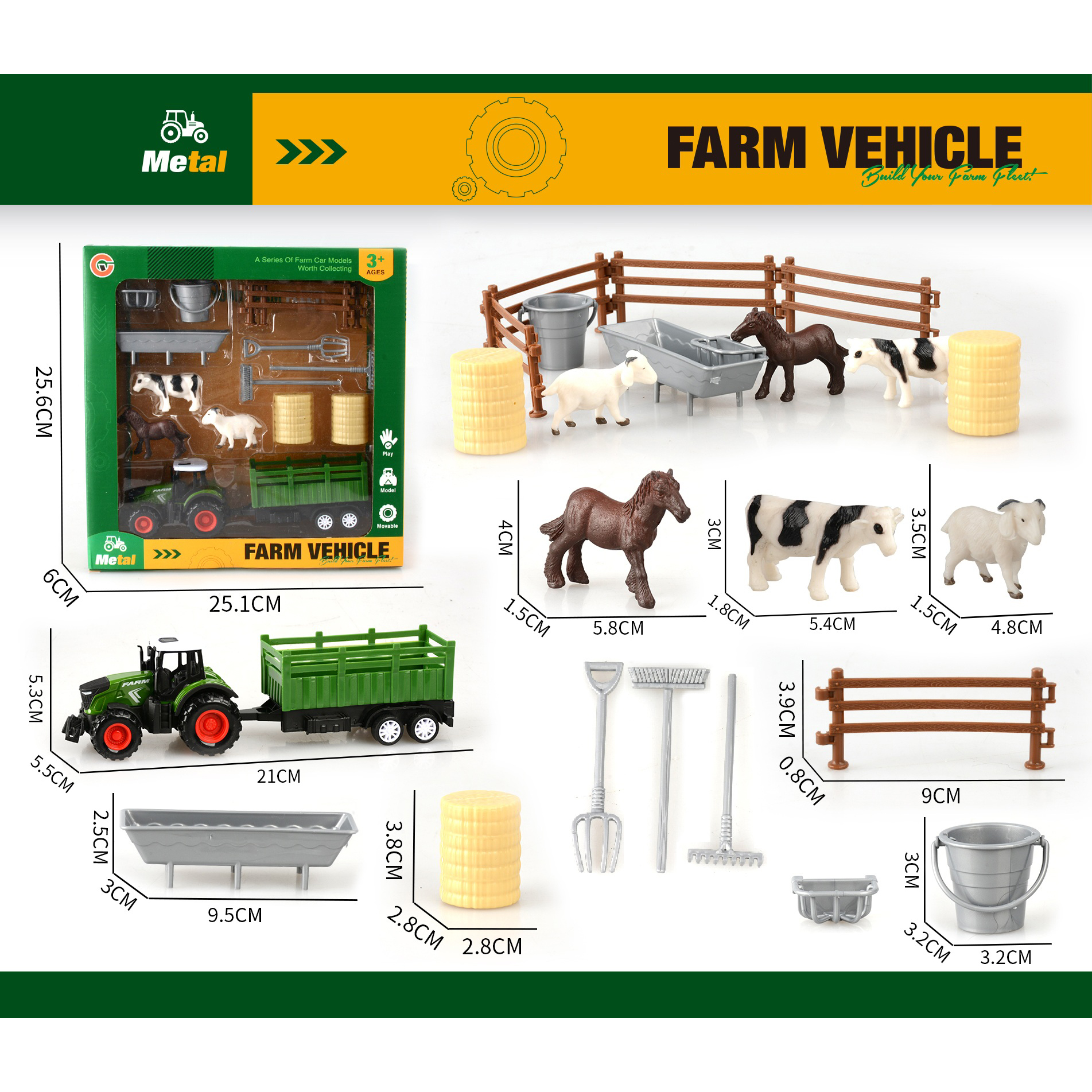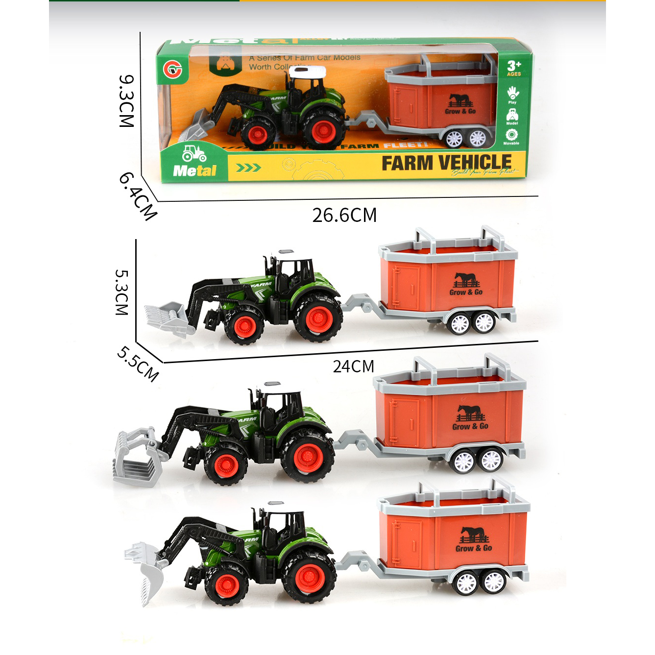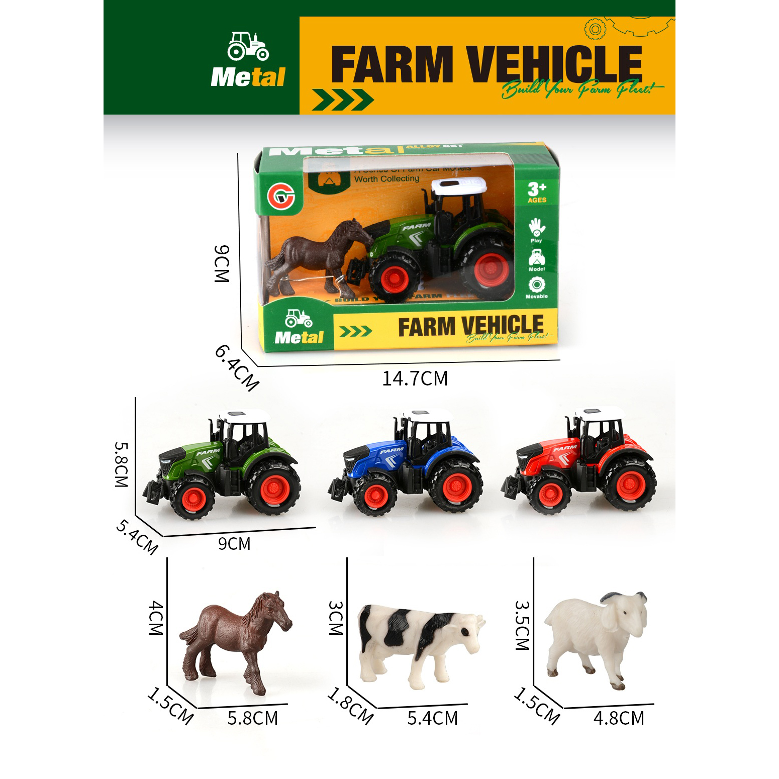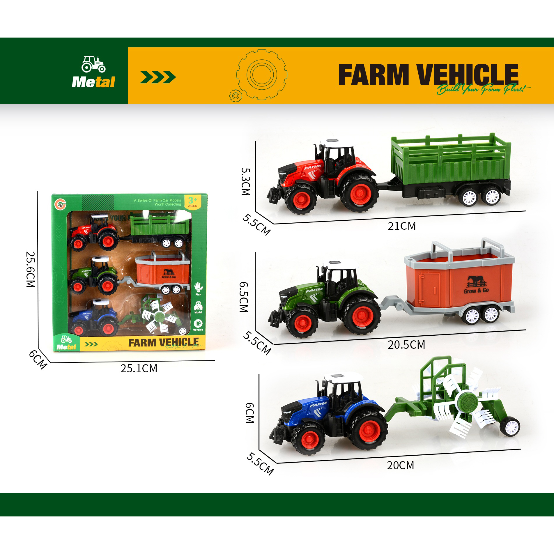 3-pack alloy pull-back farm vehicle set with 3 animals |