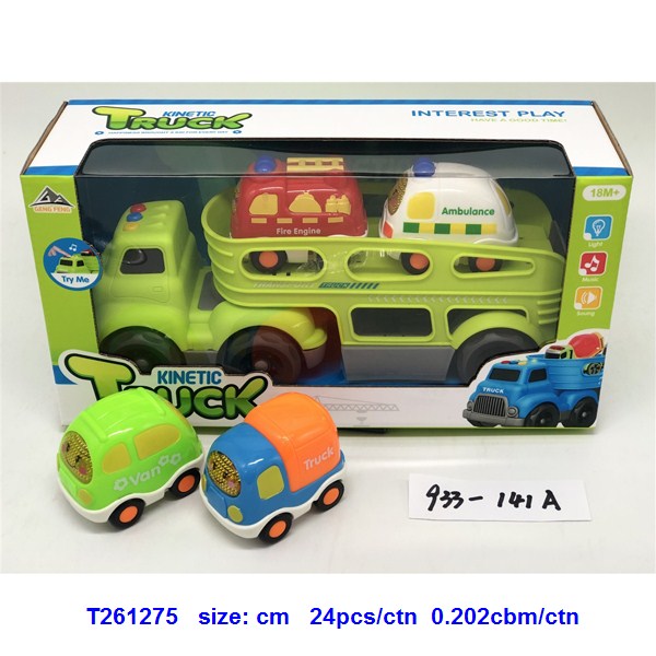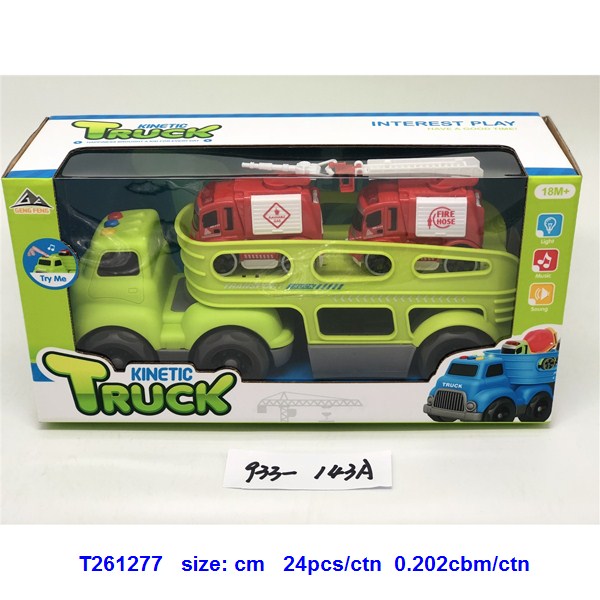 灯光音乐-滑行卡通拖头运输车(配2只惯性消防车)蓝.绿2色混装 |