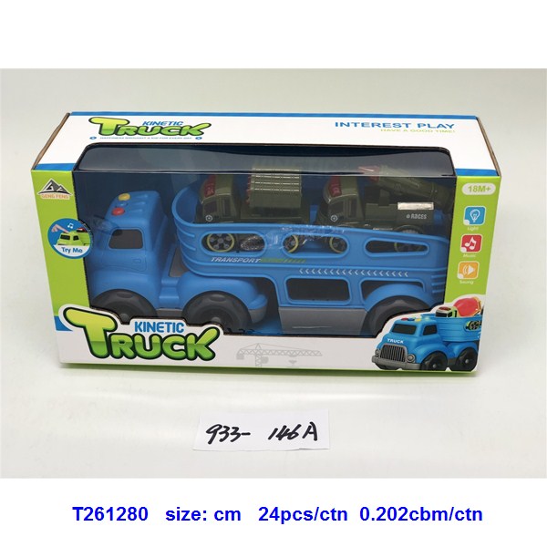 灯光音乐-滑行卡通拖头运输车(配2只惯性军事车)蓝.绿2色混装 |