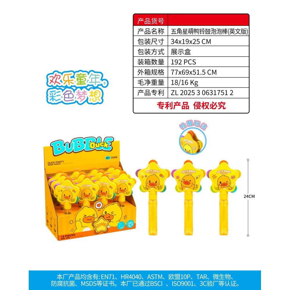 五角星萌鸭铃鼓泡泡棒 一盒12PCS 55ml |