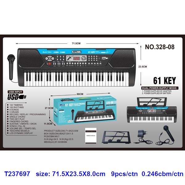 61键黑色电子琴,说明书、乐谱架、话筒、适配器、USB功能 |