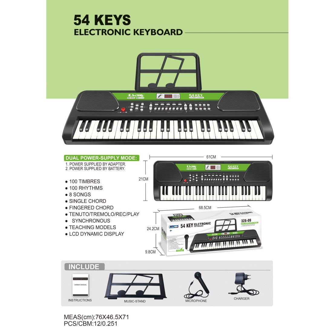 电子琴(54键、黑白两色、说明书、乐谱架、话筒、9V适配器) |