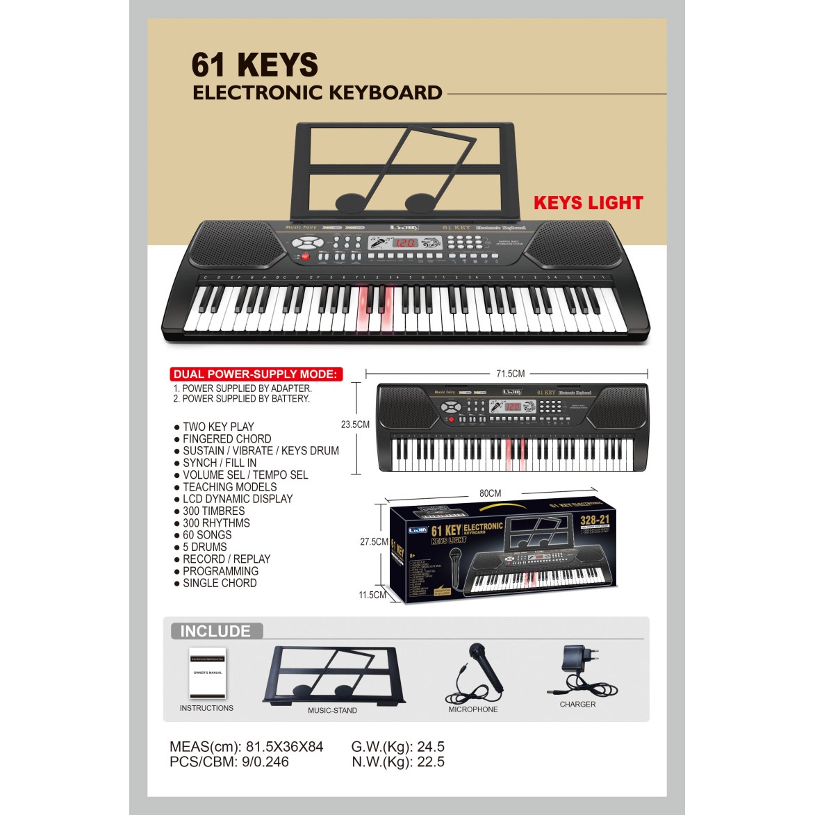 电子琴(61键、灯光版、说明书、乐谱架、话筒、9V适配器) |