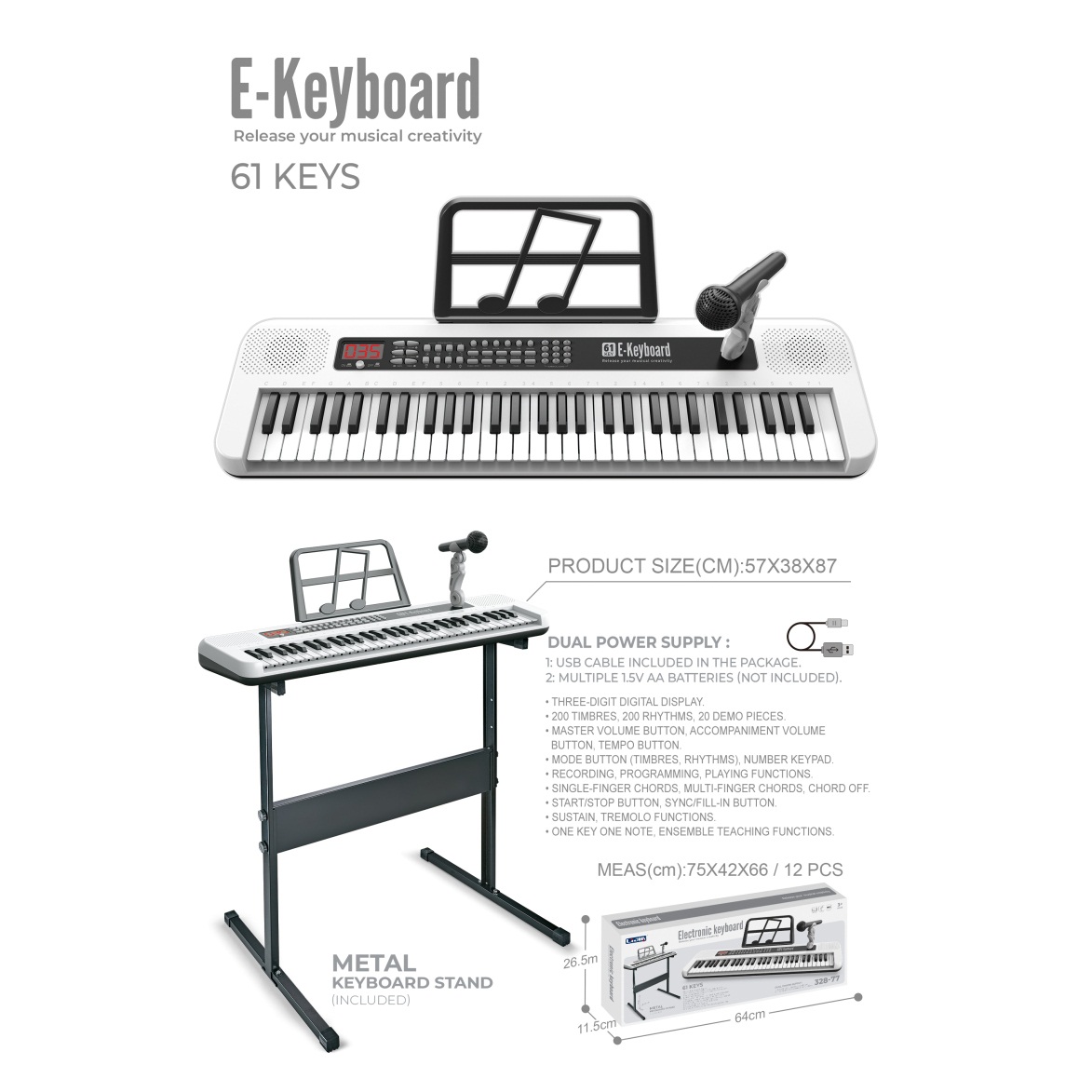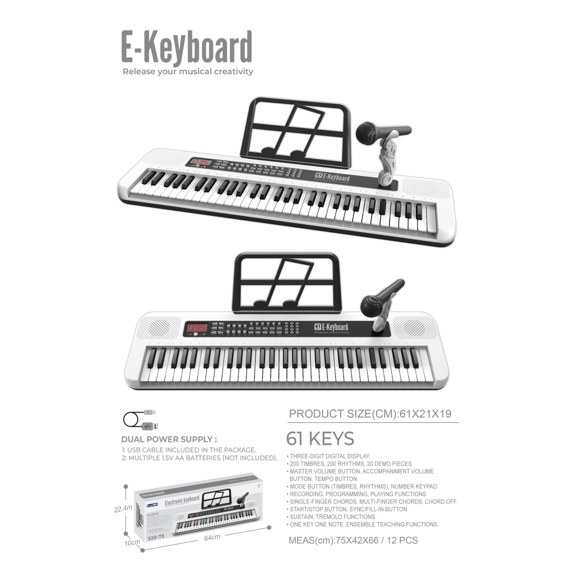 电子琴(61键、白色、说明书、乐谱架、话筒、USB供电线) |