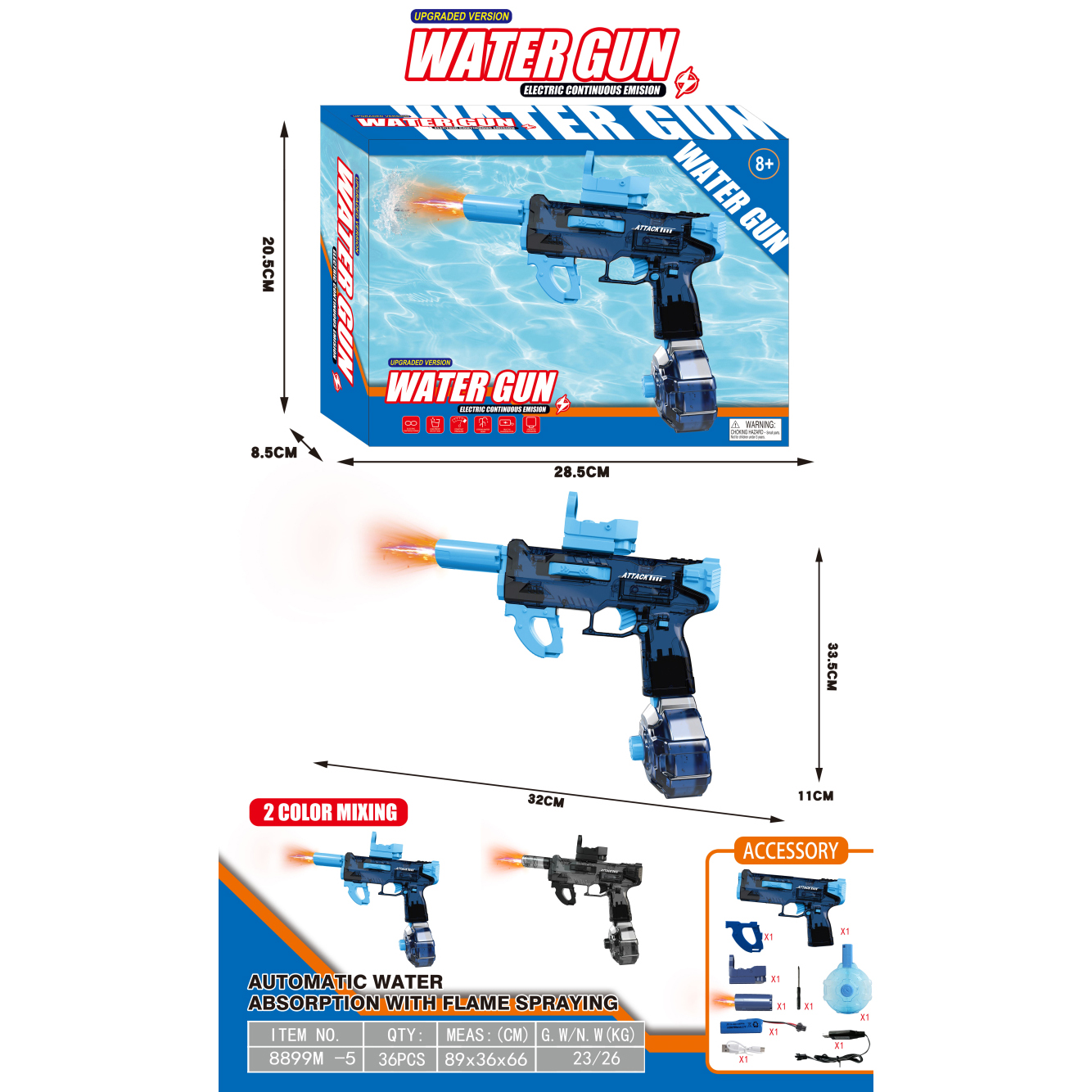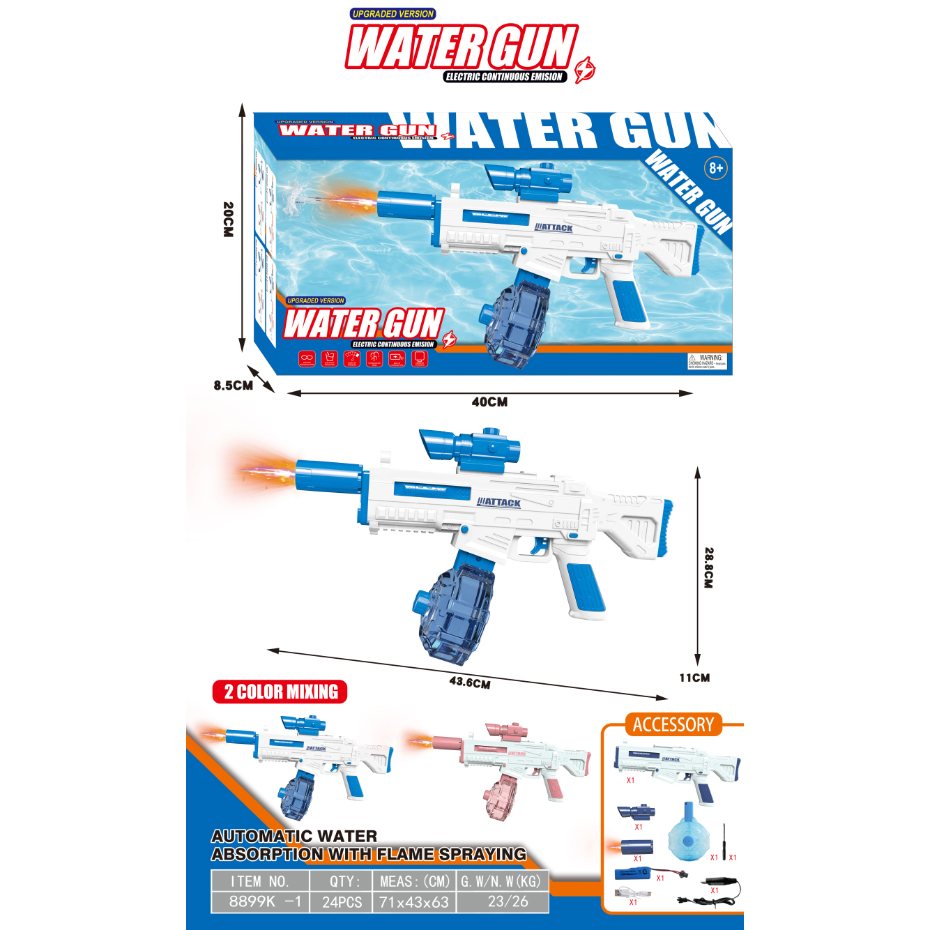 透明冰爆电动水枪+自吸版+爆闪喷火头 3.7V锂电池14500-500(包电) |