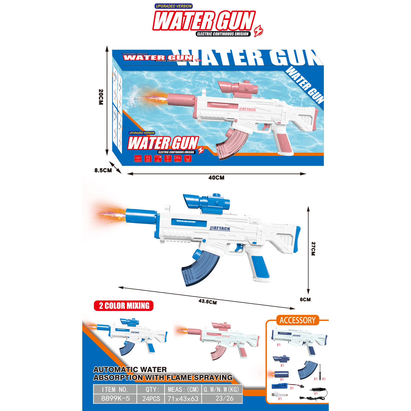 AK47电动水枪+自吸版+爆闪喷火头 3.7V锂电池14500-500(包电) |