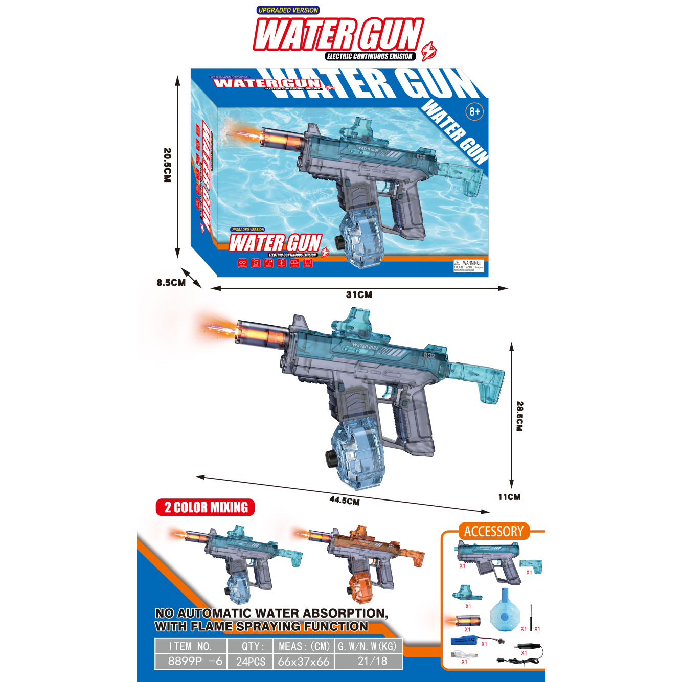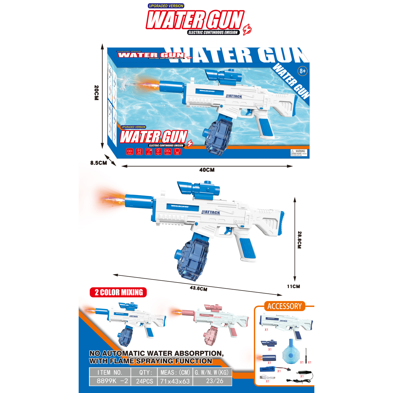 透明AK47电动水枪+手动版+爆闪喷火头 200毫升 3.7V锂电池14500-500(包电) |