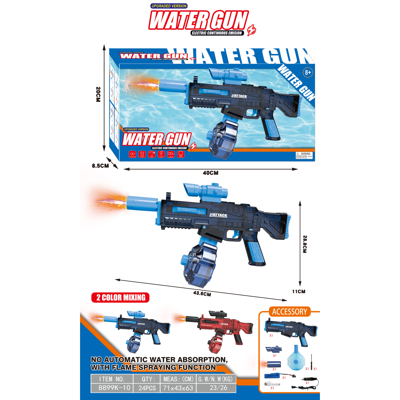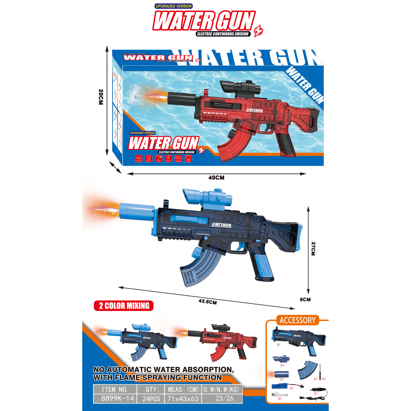 AK47电动水枪+手动版+爆闪喷火头 200毫升 3.7V锂电池14500-500(包电) |