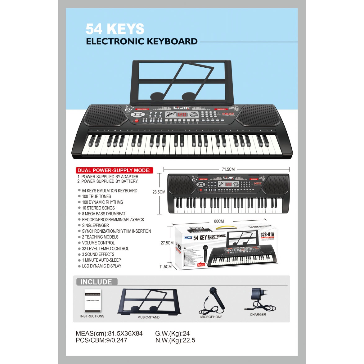 电子琴(54键、黑白两色、说明书、乐谱架、话筒、9V适配器) |