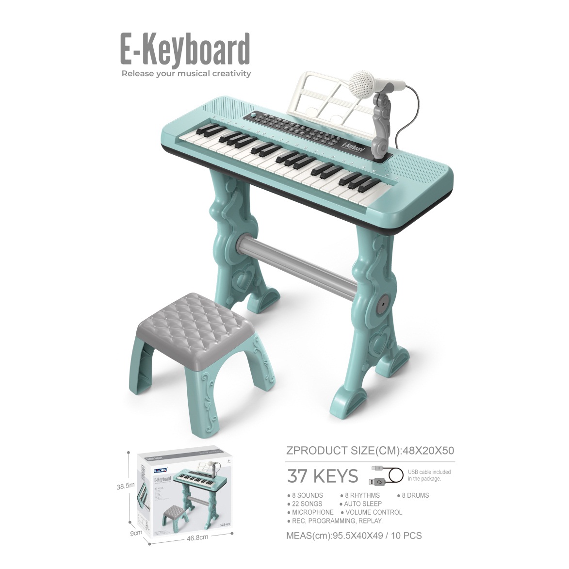 电子琴(37键、绿色、说明书、乐谱架、话筒、凳子,USB供电线) |