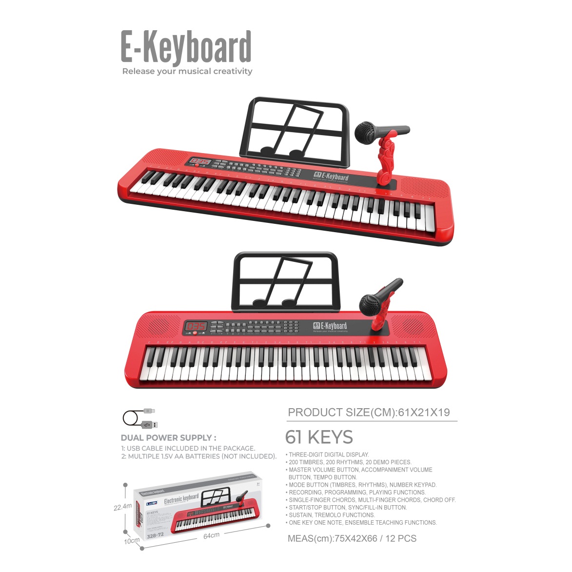 电子琴(61键、红色、说明书、乐谱架、话筒、USB供电线) |