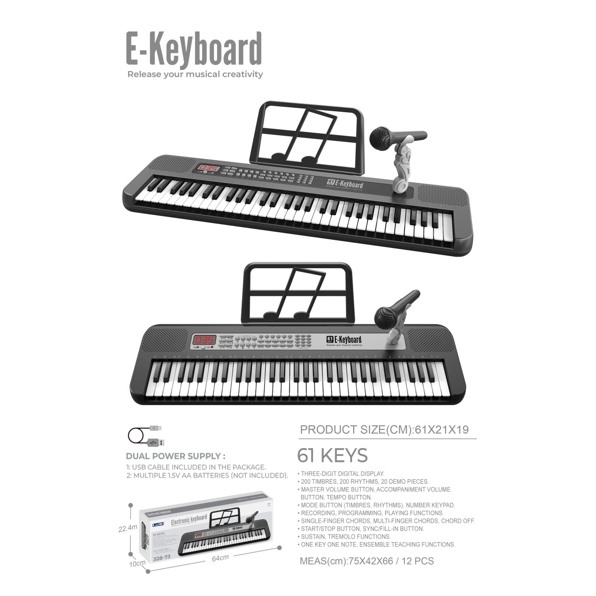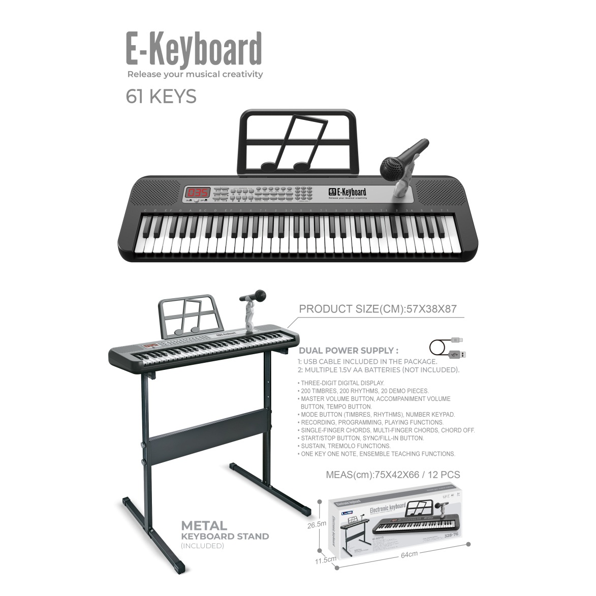 电子琴(61键、黑色、说明书、乐谱架、话筒、USB供电线) |