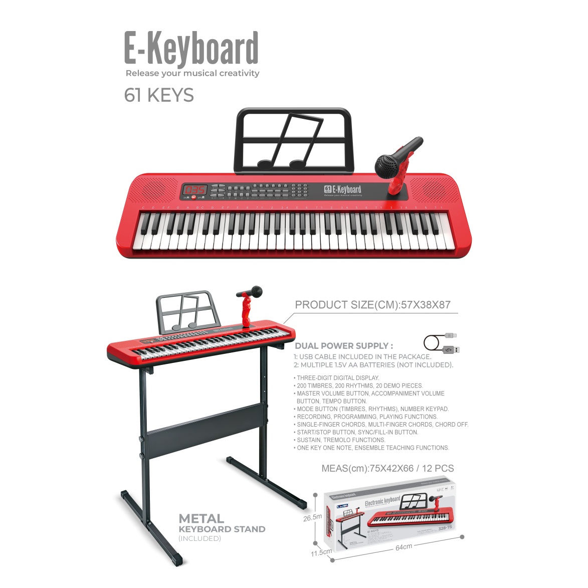 电子琴(61键、红色、说明书、乐谱架、话筒、USB供电线+琴架) |